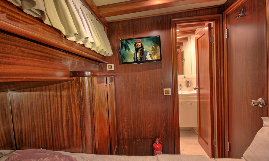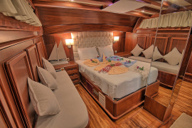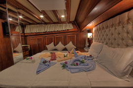 Gulet ROMANCE has 3 cabins (1 Master + 2 Double) for 6 persons. All cabins have air conditioning. All cabins have private toilets and showers. There are separate crew quarters.