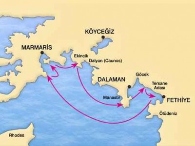 During Marmaris-Fethiye-Marmaris blue cruise, you will follow the coastline south to Fethiye, a famous Turkish market town and resort located on the site of the ancient Lycian City of Termessos. Stopping along the way to visit the Lycian tombs of Caunos reed-lined waterways of Dalyan and the islands of Fethiye Gulf, including Tersane Adasi, the largest of the islands, and once a shipyard for the Ottoman navy. In the Marmaris-Fethiye-Marmaris Blue Cruise, shore excursions are optional and require a small fee for overland transport, guides or admission to archaeological sites.