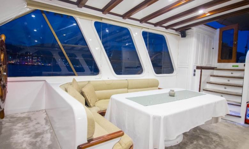 Gulet GRANDE MARE has complete navigation equipments, Mobile Phone, Generator 1x 22kW + 1x 17kW, 24 + 220 V, Life Rafts, Life Jackets, Fire Extinguishers, Fully equipped Galley, Filter Coffee, Refrigerator, Deep Freezer, Ice Boxes, Ice Maker. Spacious sun deck area with Sun mattresses and cushions, Sun awning, Cushioned aft deck with a large table, Deck chairs, spacious saloon with bar and dining table, Music Set, LCD TV and DVD player in Saloon. Speedboat with 115hp for waterski and Ringo, Big Mable. Snorkel and Fishing Equipment. Paddleboard, Canoe.