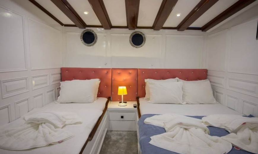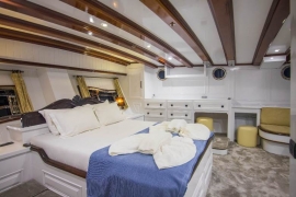 GRANDE MARE has 6 cabins (2 Master + 2 Double + 2 Triple). All cabins have air conditioning. All cabins have private home type toilets and showers. There are separate crew quarters for total of 5 crew in the yacht.