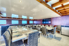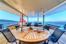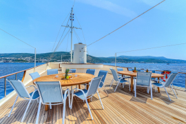 ELARA-1 has GPS, VHF, etc. all necessary navigation equipment and all required safety equipment. Fully equipped kitchen, refrigerator, deep freeze, ice maker, generator, hot water. TV, Wi-Fi, Hi-Fi Sound System. Sun mattresses and awnings both on the front and stern decks. On-deck jacuzzi. Sea ladder with platform. Tender with outboard engine. Waterskiing & Ringo. Canoe, Snorkelling Equipment, Fishing Equipment.